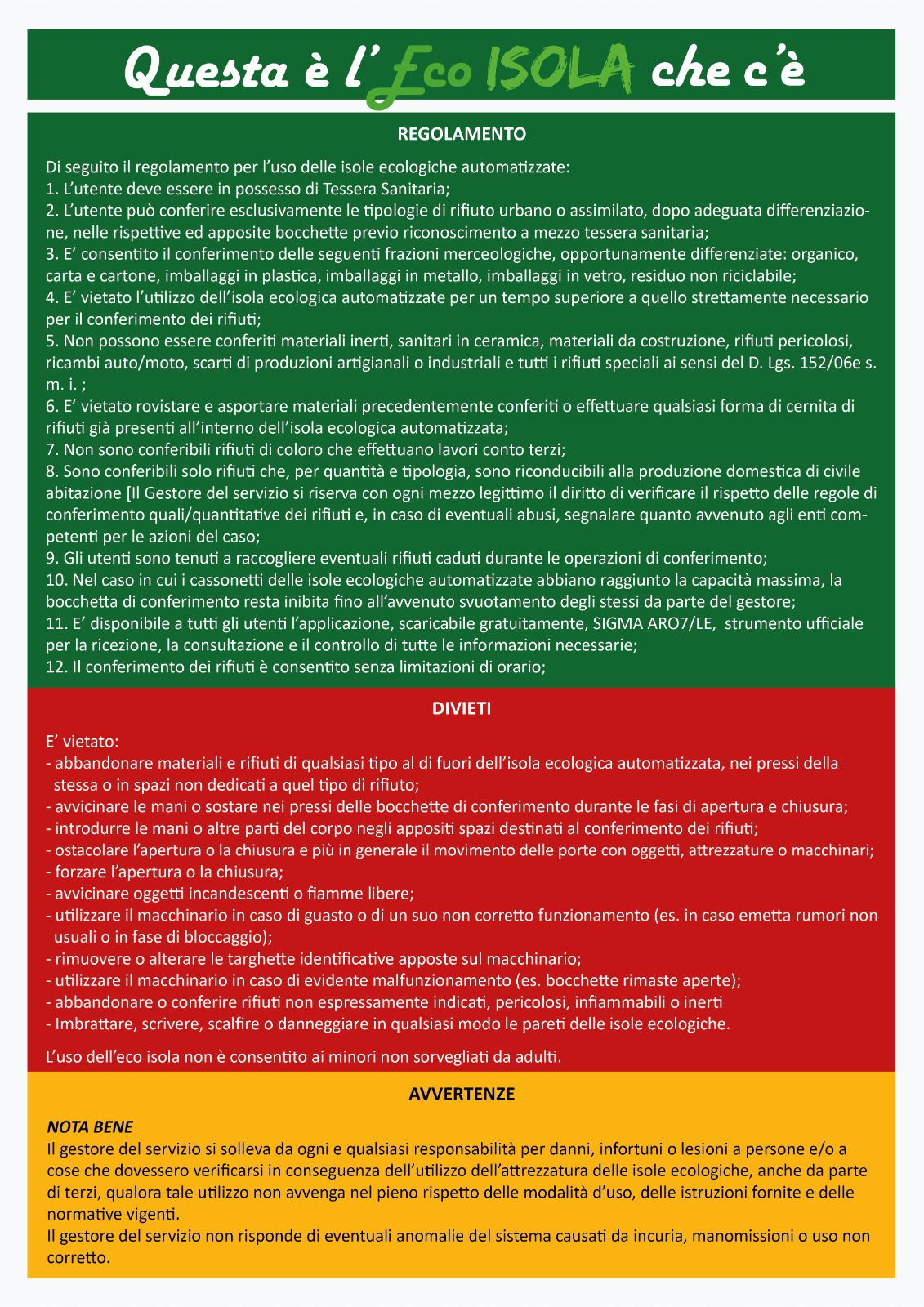 Si invita la cittadinanza a utilizzare le ECO ISOLE in modo corretto, conferendo i rifiuti solo nelle frazioni indicate e evitando abbandoni o conferimenti non consentiti.