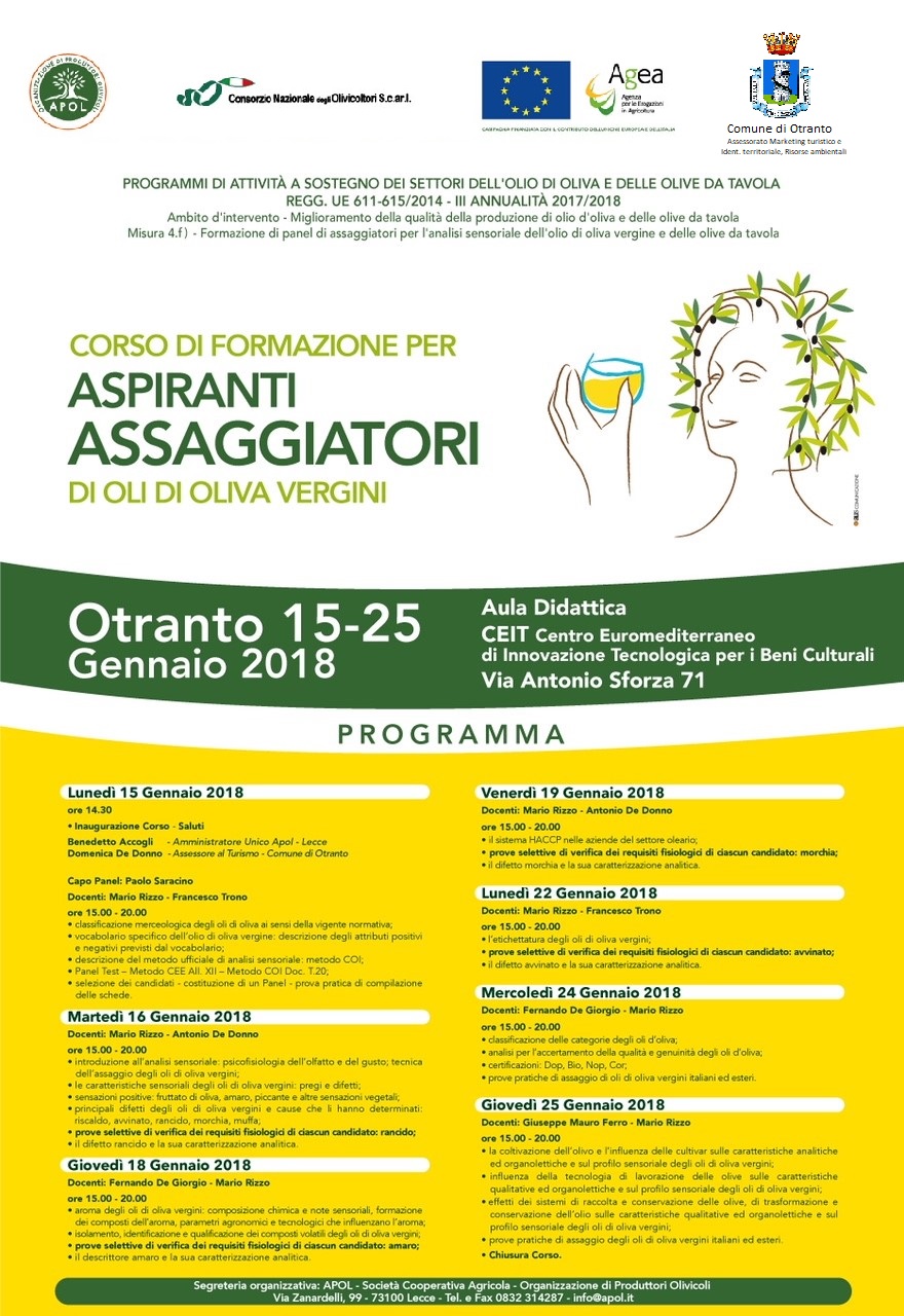 Dal 15 al 25 gennaio presso l Aula Didattica del CEIT via Antonio Sforza 71 a Otranto si terr il Corso di formazione per aspiranti assaggiatori di oli di oliva vergini Luned 15 gennaio alle ore 14 30 dopo l inaugurazione e i saluti di Benedetto Accogli Amministratore Unico Apol Lecce e Domenica De Donno Assessore al Turismo Comune di Otranto Sono ancora aperte le iscrizioni Per INFO rivolgersi alla segreteria organizzativa APOL di Lecce 0832 314287 - info apol it